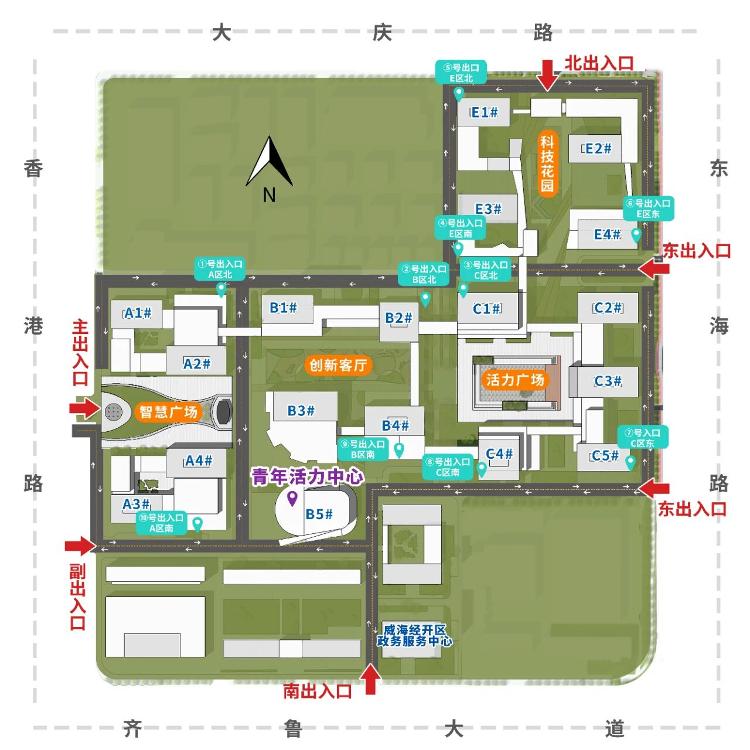 ☞自驾出行:导航“智慧谷T16艺文活力街区”即可到达智慧谷服务贸易产业园西门主出入口(香港路)。园区共有6个停车场入口,分布在香港路、大庆路、东海路、齐鲁大道4条主干道上,市民可就近选择合适的入口前往园区。